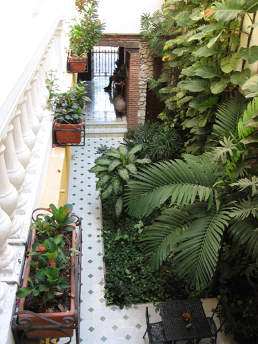 View from our room into the central courtard of the hotel, Casa de la Fe. The courtyard is open to the sky and breakfast is served there. I would have loved for it to rain just to see it in the courtyard. |